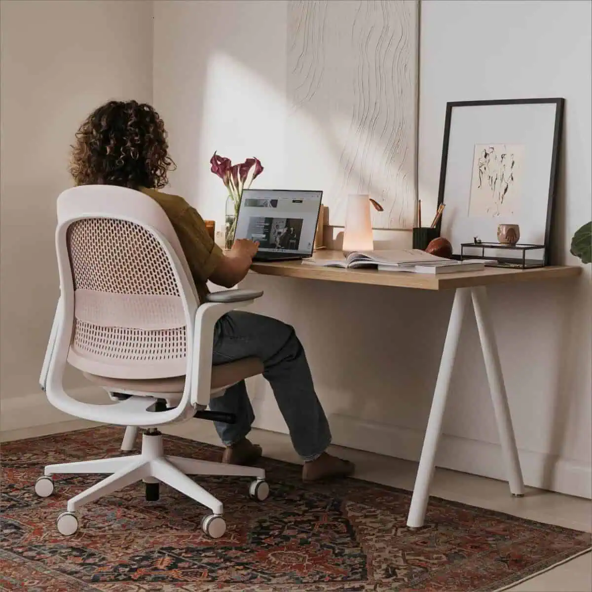 The Haworth Breck Office Chair in blush delivers tailored ergonomic support with a responsive recline, adjustable lumbar, and multi-directional 4D arms. Its premium textile seat, solid back design, and black trim frame create a stylish yet professional look. The chair adjusts to fit your height and posture needs, including seat depth customization for better leg support. Designed for both home and office use, it enhances comfort, productivity, and posture throughout the day.